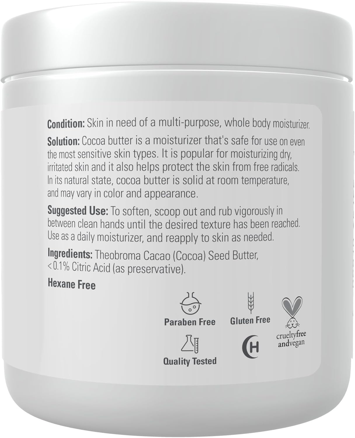 مرطب متعدد الأغراض: زبدة الكاكاو النقية بنسبة 1% هي مرطب طبيعي آمن للاستخدام حتى على أكثر أنواع البشرة حساسية.